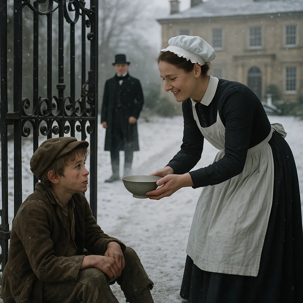 A boy. Barefoot, his face smudged with dirt, his arms wrapped tightly around his bony chest as he trembled from the autumn chill. His hollow eyes were fixed on the grand front door as if it might open to salvation.